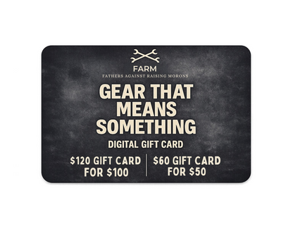 Perfect for any occasion, our gift cards allow your loved ones to choose from our exclusive collection of apparel designed for fathers committed to raising strong, independent kids. Easy to purchase and instantly delivered, this gift card is a thoughtful way to support the values of hard work, hands-on learning, and family bonding. Show your appreciation and let them pick their favorite FARM gear today!